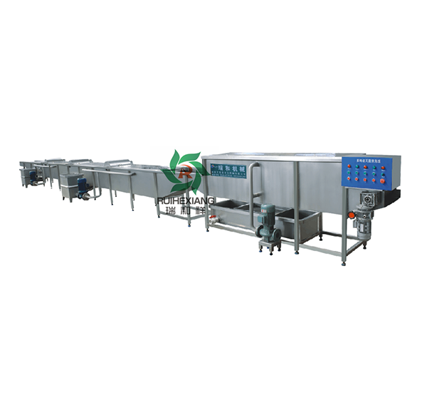该流水线由气泡清洗段、喷淋灭菌段,二次喷淋清洗段等组成,原料经由清洗机洗净后进入加入了消毒剂溶液的消毒区后,再由高压喷淋洗净原料上的消毒液,达到清洗消毒、再清洗、洗净的过程。消毒溶液采用回收装置重复利用,减少了浪费,节约了成本,提高了净菜出口标准。